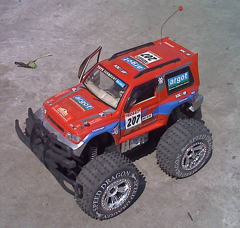 там игрушки ребенком были осмотрены, не найдено искомого (фары+открывание+большие колеса) и недрогнувшим голосом сыном было предложено походить, поискать еще. и где-то в дебрях ресторана базарчика был куплен за ~200 грн махровый китайский джип со всеми требуемыми фичами (и даже более). с закосом под японский ;-) ездит по кошеной траве, грунтовке, отмосткам. переезжает неровности в разумных пределах.