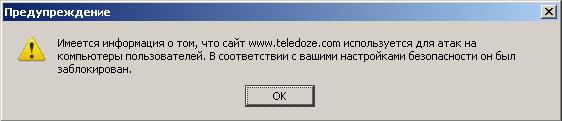Сайт підозрюється у атаці! Цей сайт, www.teledoze.com, відомий як зловмисний і тому був заблокований згідно з вашими вподобаннями безпеки.