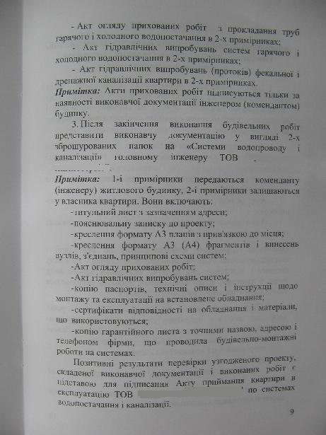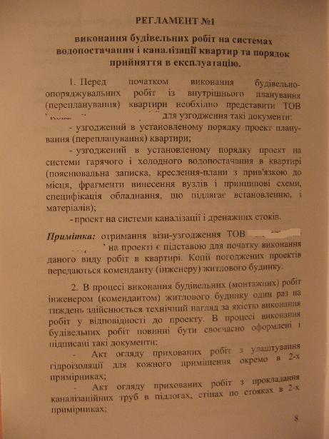 Имеем квартиру без отделки. Уже можно начинать ремонтные работы. Зашел в ЖЕК, узнать, что к чему. Ключи выдают и разрешают делать ремонт после подписания Договора. Теперь внимание. В Договоре черным по белому, причем жирным шрифтом: 7. Інші умови 7.1 Співвласник не має права без, належним чином розробленної та погодженої, документації і згоди Підприємства, виконувати будь-які роботи, пов"язані зі зміною фасаду будинку, переплануванням стін і простінків, систем енергозабеспечення, опалення, водозабеспечення та водовідведення (выделенно мной). Т.е. получается, что добавить розетку просто так я не могу. Не говоря уже про то, что-бы поставить унитаз. Должен привлекать организацию с лицензией, делать проект, согласовыть с ЖЕКом. Дополнительно выдали брошурку, где описаны этапы и согласования по водоснабжению, канализации, свету и отоплению. Во вложении типичная страничка из нее.