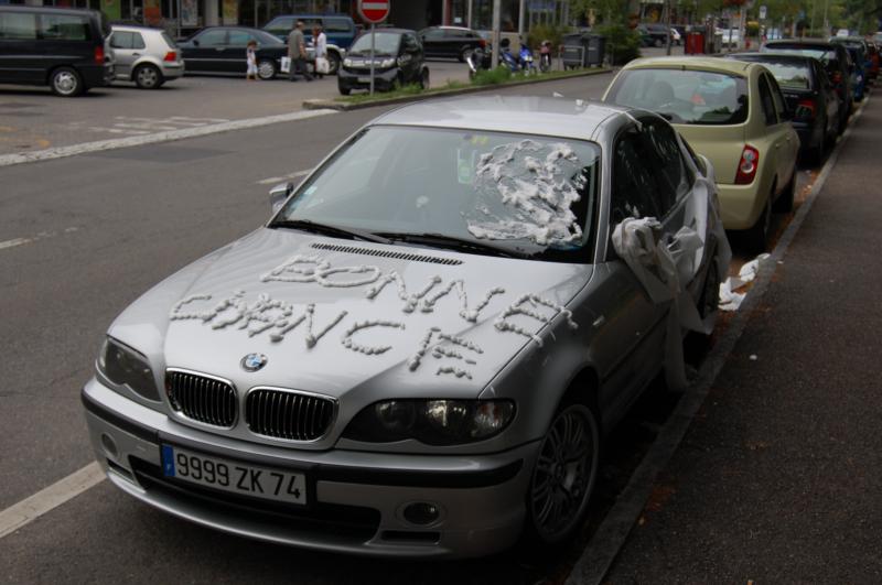 даже флегматичных швейцарцев можно довести до неадекватных действий. надпись на машине - "удачи", сделана скорее всего пенкой для бритья (монтажная пена - это слишком жёстко для местных!)