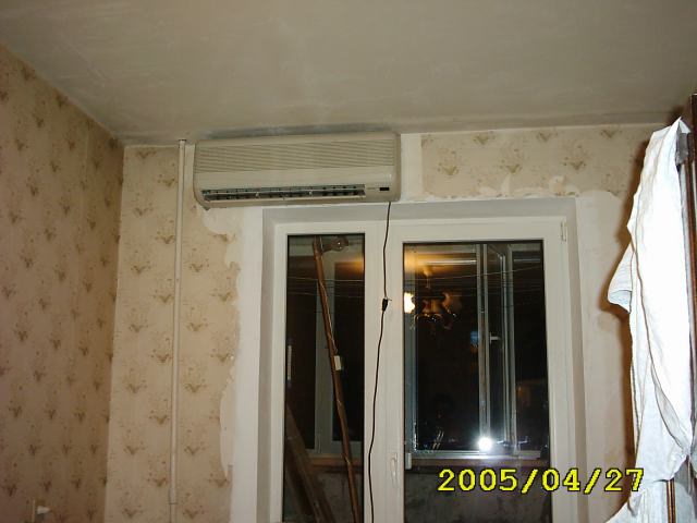 Оскільки двіжок форума убив весь написаний мною трактат , то напишу коротко з кількома фотками. Ставив в 2005 б/у Funai дев'ятку. Новий купити не міг а прохолоди вже хотілось. Перед установкою розібрав обидва блока і промив, почистив. Проклав трубки і кабель через балкон (якраз робив там ремонт). Гнув трубки "об коліно" але з розумом і по можливості з мінімальними кутами. Потім друг приїхав з інструментом, станцією, вакуумним насосом, маслом, фреоном. "Викинули" за борт зовнішній блок. Розвальцували трубки, прикрутили. Викачали повітря. Добу станція була підключена до системи і показала, що розгерметизації немає (тримається вакуум). Закачали масло, фреон. Підключили. Вже 4-й рік кондиціонер працює без проблем. Ну і пара фоток. Внутрішній блок. Поставив прямо під стелю. Цим позбавив себе довбання штроби в боковій стіні а просто пробурив стіну на балкон. Також вважаю таке положення блоку кращим ніж на боковій стіні довгої кімнати. Тим-більше, що блок стоїть навпроти дверей в сусідню кімнати тим самим дозволяючи охолоджувати зразу два приміщення.