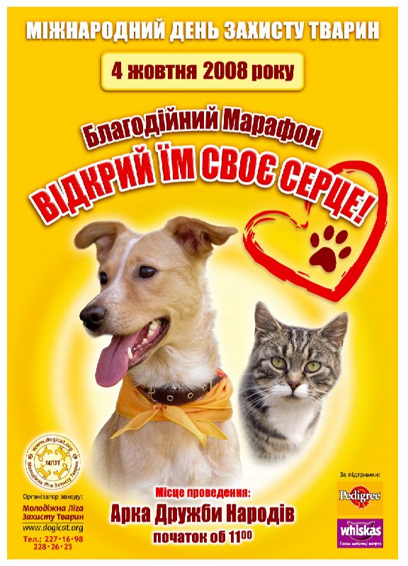 Собрать в автопробеге (колонне), приуроченому к Международному Дню Защиты Животных, максимальное число машин украшенных символикой МЛЗЖ и с четвероногими пассажирами на борту Молодежная Лига Защиты Животных - неприбыльная общественная организация, которая действует на территории Киева и киевской области. Организация выросла из движения в защиту животных, которое получило свое развитие в конце 2004 года. Членские взносы, участие волонтеров и просто небезразличных людей дает обездоленным животным шанс на здоровую и счастливую жизнь. Организация выросла из движения в защиту животных, которое получило свое развитие в конце 2004 года. Ежегодный Благотворительный Марафон «Открой им свое сердце» - приурочен к Международному Дню Защиты Животных и ставит цель заявить о проблеме обездоленных и бездомных животных, а также вовлечь в ее решение широкую общественность, городские власти и популярных людей в Украины; а также Марафон пропагандирует гуманное и ответственное обращение с животными и повышает культуру целевой благотворительности среди общественности. В рамках этого Марафона и был создан уникальный в своем формате Автопробег с животным на борту каждой автомашины. Размер колонны Автопробега зависит от количества зарегистрированных машин с животным на борту! Именно этот Пробег и имеет за цель привлечь всеобщее внимание к проблеме бездомных животных. Учитывая, что подобный Автопробег не имеет Аналогов, наши шансы закрепить за собой рекорд в Книге Рекордов Украины достаточно велики!