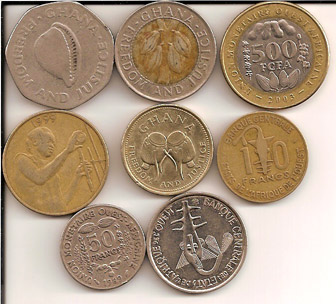 от поездок остались монеты: латвийские латы (1 и 2) и сантимы (1,2,5,50), польские злотые (1) и гроши (1,2,5,10,50) - могу отдать по текущему курсу...Русские рубли в подарок... Кроме того знакомый негр просил помочь в продаже по коммерческим коллекционным ценам экзотические валюты республик Гана (седисы) и Того (франки)...Фото прилагаю...Камрады коллекционеры, сколько такие монеты могуть стоить и вообще стоят ли шото?...... сам в этом ничего не смыслю....