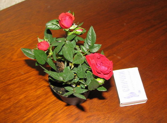 1) Как на картинке. Спички - для масштабу. Называется mini-rose. Вопросы: - кем оно будет, когда вырастет (шансов выжить с моим уходом немного, но вдруг:))? Будет большой куст с маленькими розочками? - че сейчас делать - пересадить в горшок побольше? - как пересаживать? насыпать новый грунт в большой горшок и вставить розу в середину, вместе с землей вокруг корней?