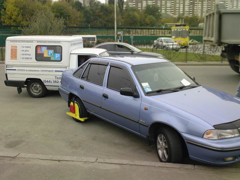 Сейчас на ЖД вокзале Южном.Спустил, колесо,снял блокиратор,а они на заднее правое еще один повесили.