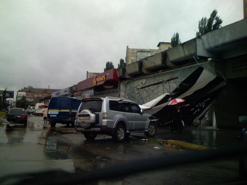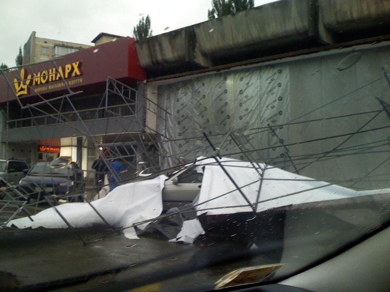 По-моему это был анонс открытия АДИДАС. Накрыло БМВ пятерку предыдущую и по-моему Цивик, тоже не новый. Под тканью не видно степень повреждений. Милиция уже стоит фоткает.