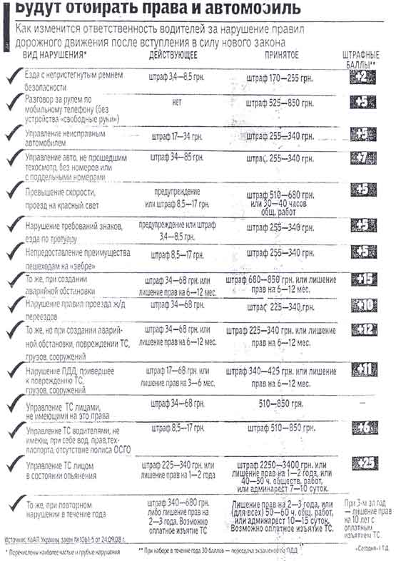 Многократно возрастут штрафы за нарушения ПДД. За превышение скорости больше 20 км/час. штраф составит от 255 до 340 грн., а более 50 км/час. - от 510 до 680 грн.; - за нарушение правил перевозки пассажиров предусмотрен штраф от 170 до 340 грн.; - за управление траспортным средством в состоянии алкогольного опьянения в первый раз штраф составит от 2 тыс. 550 до 3 тыс. 400 грн. инспектор ГАИ теперь будет определять меру ответственности нарушителя Инспектор ГАИ получает право изъять права, автомобиль или талон техосмотра фиксировать нарушения ПДД ГАИ сможет с помощью фото- и видеосъемки и составлять протокол без участия нарушителя появляется мера наказания - административный арест за нарушение ПДД появляется мера наказания - общественные работы запрещено пользоваться мобильным телефоном за рулем необходимо регистрировать скутера и мопеды. Но по словам С.Коломийца, норма регистрировать мопеды как транспортное средство вступит в силу с 2009 года. Хотя, по словам начальника департамента ГАИ Украины, некоторые регионы такую практику регистрации мопедов уже внедрили сегодня, в частности мопеды регистрируют в Винницкой, Житомирской и Одесской областях.