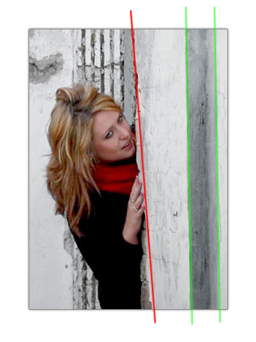 Волосы такое общущение шо криво обтравлены. Тёмная кайма. И вот эта стена за которую она держится, она косая. Из-за этова кажется, что фотка завалена влево и приходится напрягать органы зрения и сличать остальные линии.