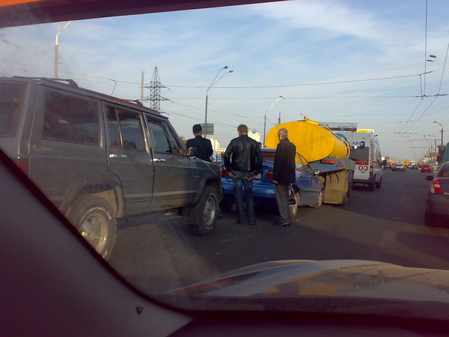 Была небольшая пробка - Ланос легонько стукнул "молоковоз", а Чироки помог Ланосу "сесть" на фаркоп "молоковоз".