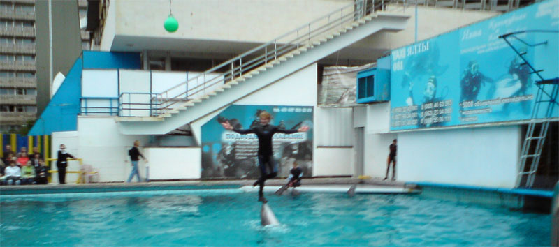 Дельфинарий при Ялте-интурист. Стоимость 40 гривен со взрослого, по зрелищности уступает дельфинарию при Биостанции(Курортное), как-то немного затянули с продажей колец для бросания дельфинам, аукционом с картиной, нарисованной дельфином, но всеравно, были красивые номера.