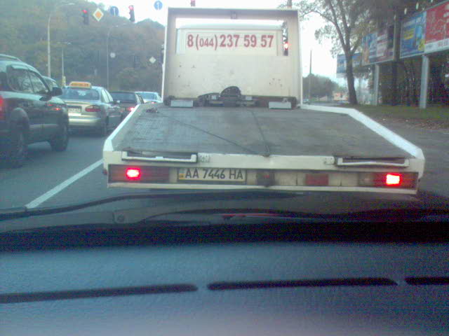 Становлюсь на светофоре посредине Киквидзе на красный, слева от меня становится Жига-шоха, справа ряд пустой. Жду зелёного, трогаюсь; хоть и на горку, разгоняюсь привычно резво. Скорость подходит к 55-60, как справа меня обгоняет эвакуатор Мерседес и молча, даже без указателей начинает тупо выдавливать в левый ряд -- судя по всему, он решил проскочить стоявших у светофора по правому ряду, но потом упёрся в припаркованные машины. Зажимаю клаксон, по зеркалам проверяю, что слева Жига далеко от меня, принимаю чуть левее, широкая платформа Мерса проносится буквально в 10 сантиметрах от моей правой стойки. На следующем светофоре он повторяет тот же манёвр: без указателей ломится в правый ряд, обходит плавно трогающиеся машины, упирается в запаркованных дальше и так же тупо без указателей выщимливается в средний ряд под дружные матюки тех, кто там ехал. Но это я уже наблюдаю издалека: мне на Подвысоцкого направо. Доезжаю до Бастионной, как раз включается красный. Стою, жду. Не особо торопясь доезжаю до Дружбы народов -- и ба! кого же я вижу?! Мерс-эвакуатор валит по бульвару сверху под 90 км/ч. От таких товарищей стараюсь держаться подальше, пропускаю, выруливаю на бульвар... Короче, на светофоре внизу бульвара я стоял сразу за ним (см. фото кросавчега)