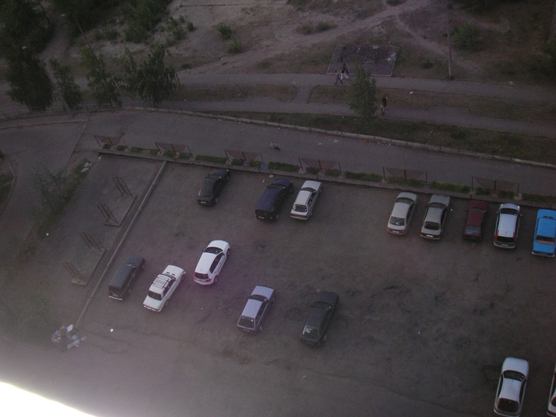 На придомовой парковке. Водитэл зазжал на парковку со скоростью быстрее местных, зашёл в соседний подъезд. Я через 5 минут сфотографировал с балкона. Для тех, кто интересуется, номера начинаются с АК.. :-)
