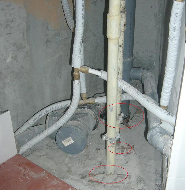 Ситуация такова. Кафель уложен по санузлу, а в этом закоулке, где трубы, даже нет стяжки, как было от строителей, так пока и есть. Вопрос в чем. Делать там что-то, или нет? трубы там пропущены в дырки строительной конструкции плитЫ (обвел красным). Законопачены пенопластом и паклей и все, вокруг канализации дыра приличная, вокруг труб маленькие. Думаю про форс-мажор. Например, у меня раз стиралка вылила на пол воду, по моей вине. так эта вода ушла к соседям именно через эти дыры. Внизу у соседей никаких проблем, ремонта нет, но даже если бы был, то вода прошла именно в этом закоулке, не нанеся ущерба отделке. И если я залью эти дырки, то тогда куда пойдет вода в случае чего? может и никуда, у меня будет стоять, пока не вычерпаю, а ведь может и щели найти и выйти там, где совсем не нужно. а не заливать, так как-то не красиво, хоть и за перегородкой спрячется.
