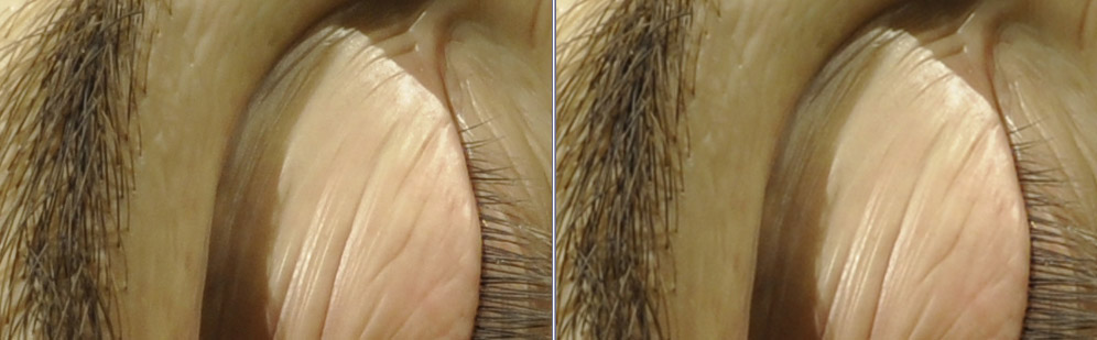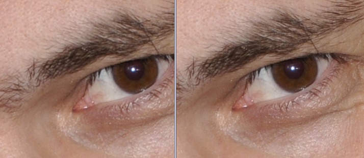 Полукадры с глазом не одинаковы по обрезке, на правом-резкость , контраст... Веко с бровью:правый снимок -резкость, затемнение