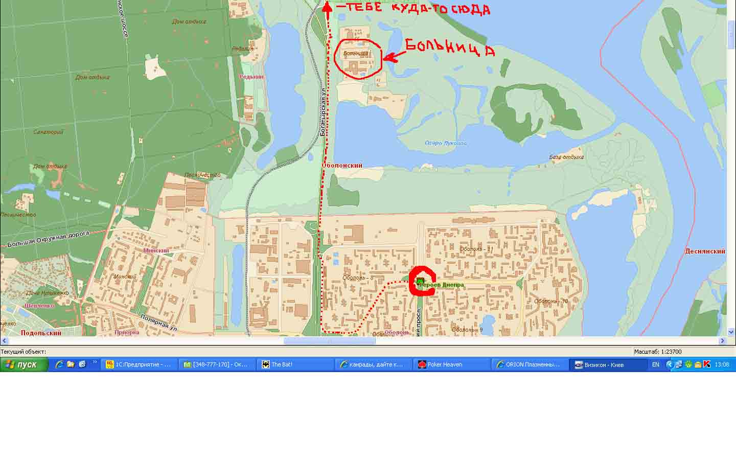 кп оболонь по богатырской, там будет больница и такая большая железная конструкция в виде высокой елки. там поворот направо к днепру. ул. САДОВАЯ-5, дом 1.