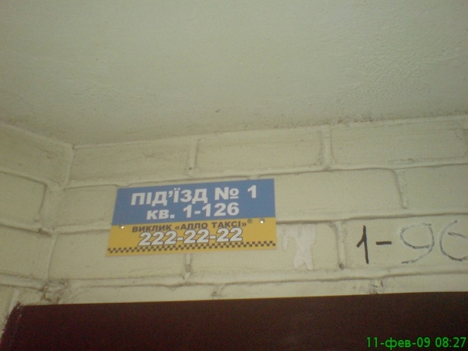 А ты видел таблички над подъездами, которые с номерами квартир? Это идея "аллотакси" (тел 2222222). В глаза бросается Надо фотку таблички - сделаю и вышлю.