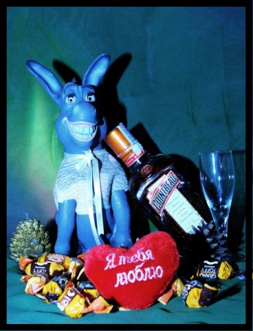 Осталось найти загадочное связущее звено между ослом, новогодней шишкой, валентинкой, пол-кило шоколадных конфет, французским ликером и бокалом под шампанское.