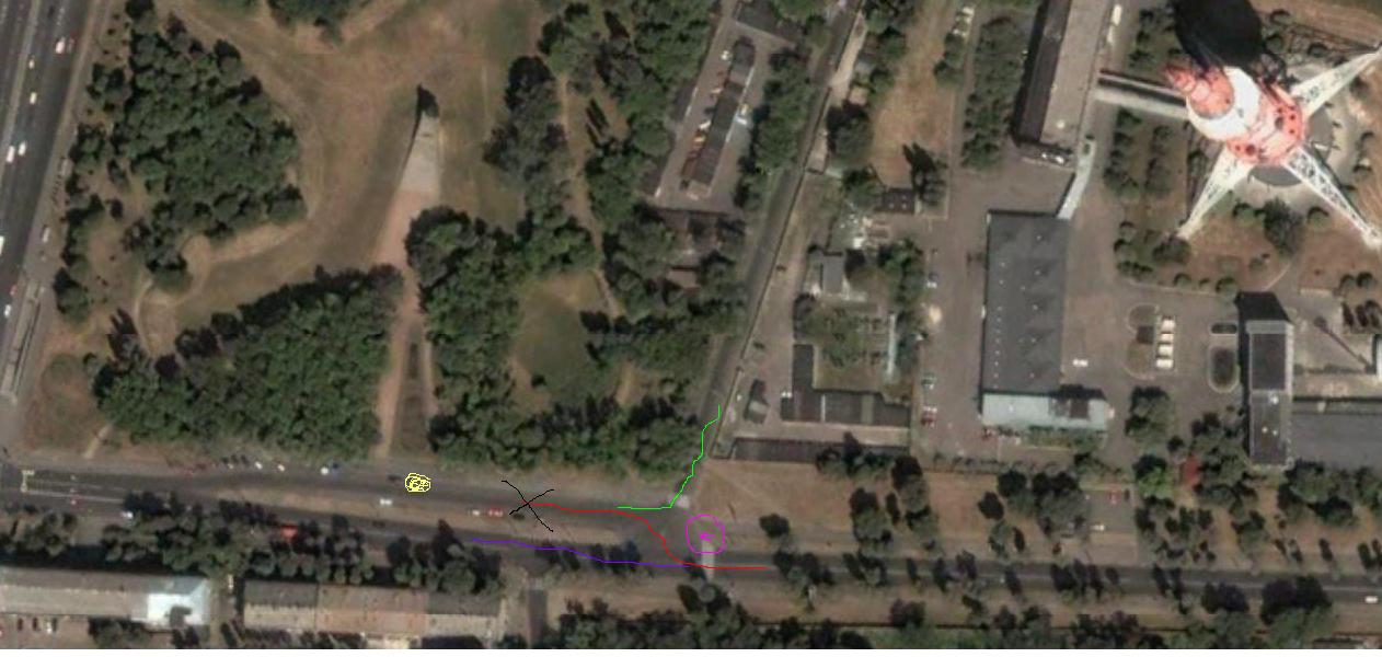 Красное - мой путь для парковки Фиолетовое - типа так по правилам Кружочек со стрелочкой типа - это знак "Только прямо" Зеленое - это кто с Мельникова едет и в "карман" ныряет. Их не трогают. Жёлтое чмо - это засада дайцев.