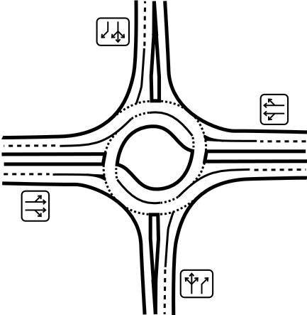Анимация, иллюстрирующая движение на круговом перекресте. Правила проезда перекрёстка и подачи сигналов о повороте — европейские