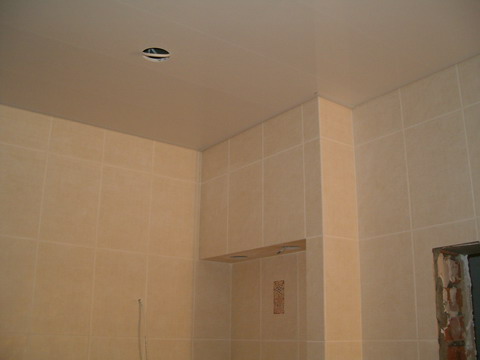 Влагостойкий гипсокартон, по центру поликарбонат на зеркальных профилях. Лампы дневного света.