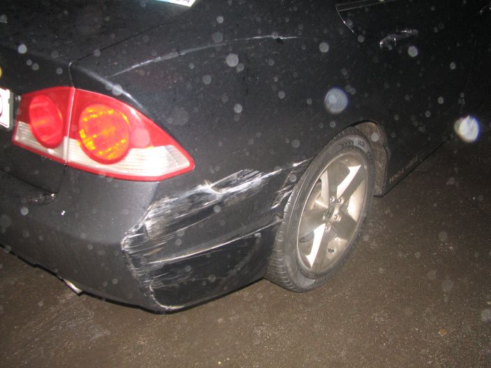Поц сдавал задом со двора и притерся к свежепокрашенному бамперу и крылу, сука.. Потом резво вывалился задним ходом через сплошную на дорогу и утулил.