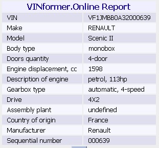 Насколько мне известно, в Renault не зашифровывается в VIN год выпуска - в частности, поэтому по стране бегает куча рестайлинговых R5/R19/R21 выпуска начала 90х, на которые перенесены номерные "стаканы" или стенки багажника. Однако, в Dialogys я не нашел Scenic II с кодом кузова JMBB, что теоретически может означать что это какая-то совсем новая фаза (что маловероятно но возможно), скажем конца 2007г. А собственно, в чем проблема получить от салона справку о дате выпуска, на фирменном бланке от Renault? Пускай они составят запрос прямиком на завод, или самому сделать по email. Собственно, VINformer утверждает, что это: