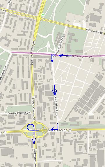 проехал мимо Оранжерейной по Дорогожицкой, с целью повернуть налево на Телиги.