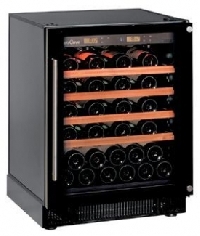 А схожесть дизайна с кухонными не устроит? Ведь есть варианты винных шкафов, которые предназначены для встраивания в кухонную мебель. Как раз на 38 бутылок рассчитанные. При том мультитемпературные. Размер 82х59,4х56,6 см. Дверь может быть из стекла, или техническая, предназначенная для отделки в стиле кухни. А большего размера шкаф рассчитан на количество бутылок больше сорока. Зачем тебе лишнее пространство в шкафу, если оно не будет использоваться? Примерно такие.
