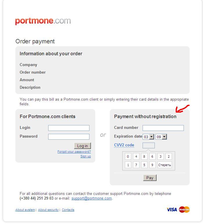 если не ошибаюсь, у портмоне для инет магазинов есть форма, для ввода данных без регистрации для клиента почитай http://www.portmone.com.ua/shops/ru/term/ вроде как оно так форма для оплаты выглядит: