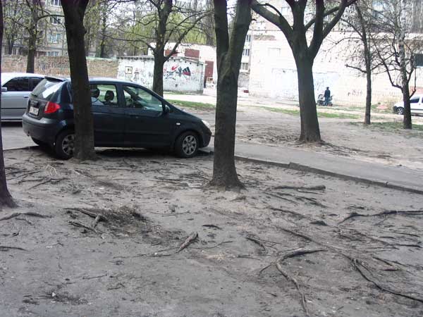 А вот владельцу этой машины у меня язык не повернётся сказать, что он стоит на газоне. Причём, на этом участке (и многих аналогичных возле дома) НИКОГДА не было травы.Они всегда были в таком виде. Даже в те времена, когда во дворе стояло 3-5 машин на 3 дома. И я ни разу не видел, что бы дворники хотя бы что-то попытались там сделать. А вот если ЖЭК там наведёт порядок, разобъёт газон, посеет травку,огородит, дворник будет поливать и ухаживать (кстати, это не мои фантазии. На сайте КМДА все эти услуги ЖЭКа входят в мою квартплату), то тогда я первый обзову водителя этого ТЕТЦа нехорошими словами. А, если не поймёт,то и колёса поспускаю.