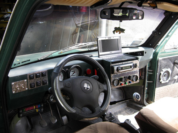 Общий стиль мне понравился. Из замечаний - блок в котором стоит магнитолка имхо уж очень сильно выпирает - и этот угол в сторону штурмана может быть причиной травм в случае не дай бог ДТП. И еще - добавь обязательно козырек над приборами в районе руля - бликовать меньше будет, и засветка приборов не будет мешать ездить ночью.