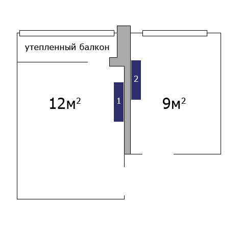 Есть две комнаты 12 и 9 соответственно. На общей стене, где я пометил желательное местоположение кондиционеров, уже проведена для них электрика.