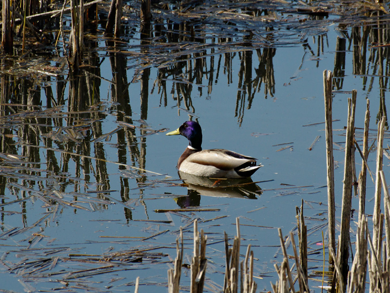 Вроди как стандартная кряква, "брачная окраска селезня", однако везде голова у него зелёная, а у этого фиолетовая ...