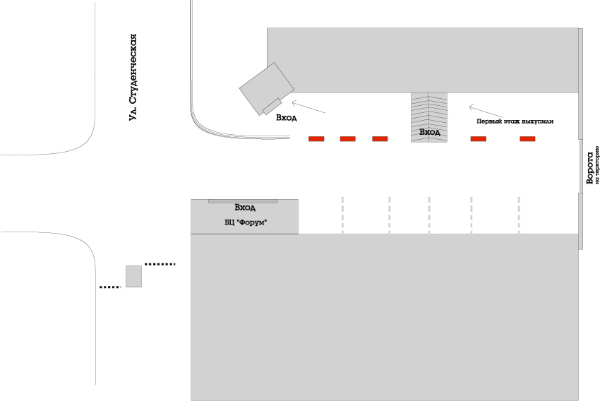 Возле БЦ-Форум, в доме напротив по ул. Студенческой был магазинчик, потом помещение сдавалось в аренду долгое время и вот кто-то таки его занял. Похоже, что будет какой-то магазинчик или еще чего, пока не ясно. Делается ремонт и т.д. Я и другие работники с БЦ парковались там обычно на целый день. Мест всего 6 с одной стороны и 5 с другой. Между припаркованными машинами проезд в ворота с ул. Студенческой. Так вот новый владелец понатыкивал парковочных блокираторов в асфальт (обзначил красным) и таким образом захватил, что ли, кусок територии.