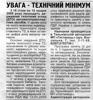 Собрался я было пройти техосмотр по месту регистрации в Черкасской области. Оказывается, для прохождения ТО необходимо пройти ликбез в местной автошколе Это как понимать - наше доблесное ДАЙ решило по-легкому срубить бабла с и так не богатых жителей сельской местности или как? Подскажите, как с этим бороться? Вырезку с местной газеты прилагаю.