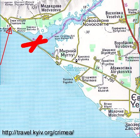 с. Знаменское (Знамянське), см карту Легенда проезда такова: по селу идет главная дорога,на перекрестке нуно сьехать на второстепенную (если из Черномоское то соотв уйти как бы правее), далее пару км идем вдоль моря и справа по ходу видим в степи возвышенность/насыпь (это и есть раскопки). Сьезд с дороги не обозначен, но ориентр таков: прямо по курсу покажется "крепость"/база отдыха, недоезжая которой сворачиваем направо на грунтовку (на бетонном заборе будет начертано "небеса скифов", на небольшой развилке на грунтовке берем исчо правее, т.е. как бы возвращаясь), метров через 200-300 и будет Беляус. ! Проезда через о. Донузлав (напрямик по кромке моря) нет, по крайней мере не было !! Дороги в тех краях немного в ямках, но рулить моно,
