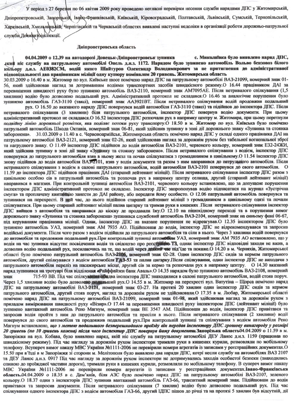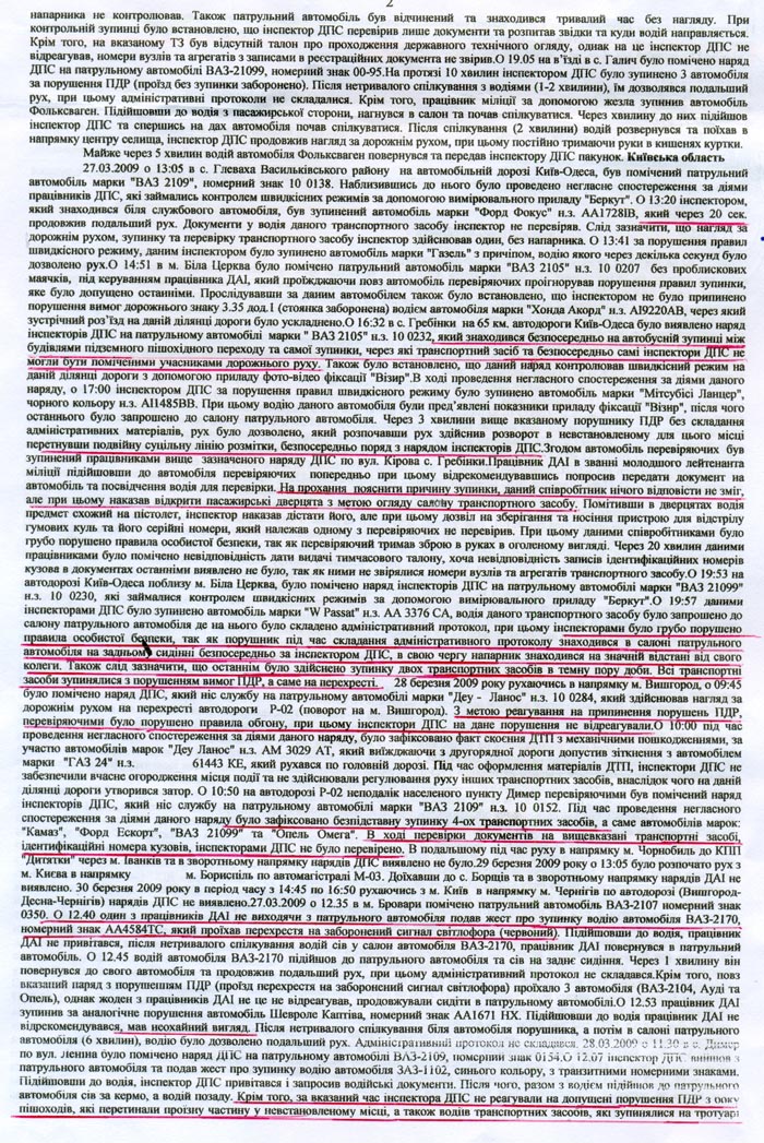Тернопольська область.02.04.2009 року о 13.50 в м. Чортков, Тернопольської області на вул. С. Бендерн автомобіль переворяючих зупинено працівником ДПС нагрудннй знак ТЕ0214, який здійснював нагляд за дорожном рухом один, без табельної зброї, на приватному автомобілі ВАЗ-2107, номерний знак ВО 1655 АЕ. В той же час, нереагуючи на зупинку працівника міліції, проїхав автомобіль ВАЗ-2101, номерний знак 699-79 ТІ, зеленого кольору та заїхав у двор. На запитання перевіряючих, чому інспектор не вжив заходи щодо зупинки вказаного автомобіля, інспектор ДПС повідомив, що "він за ним гнатися не буде". В подальшому, під час складання адміністративного протоколу, інспектор ДПС не мог визначитися, де дійсно було скоєно правопорушення, вказував спочатку одну вулицю, потім закреслив та написав другу