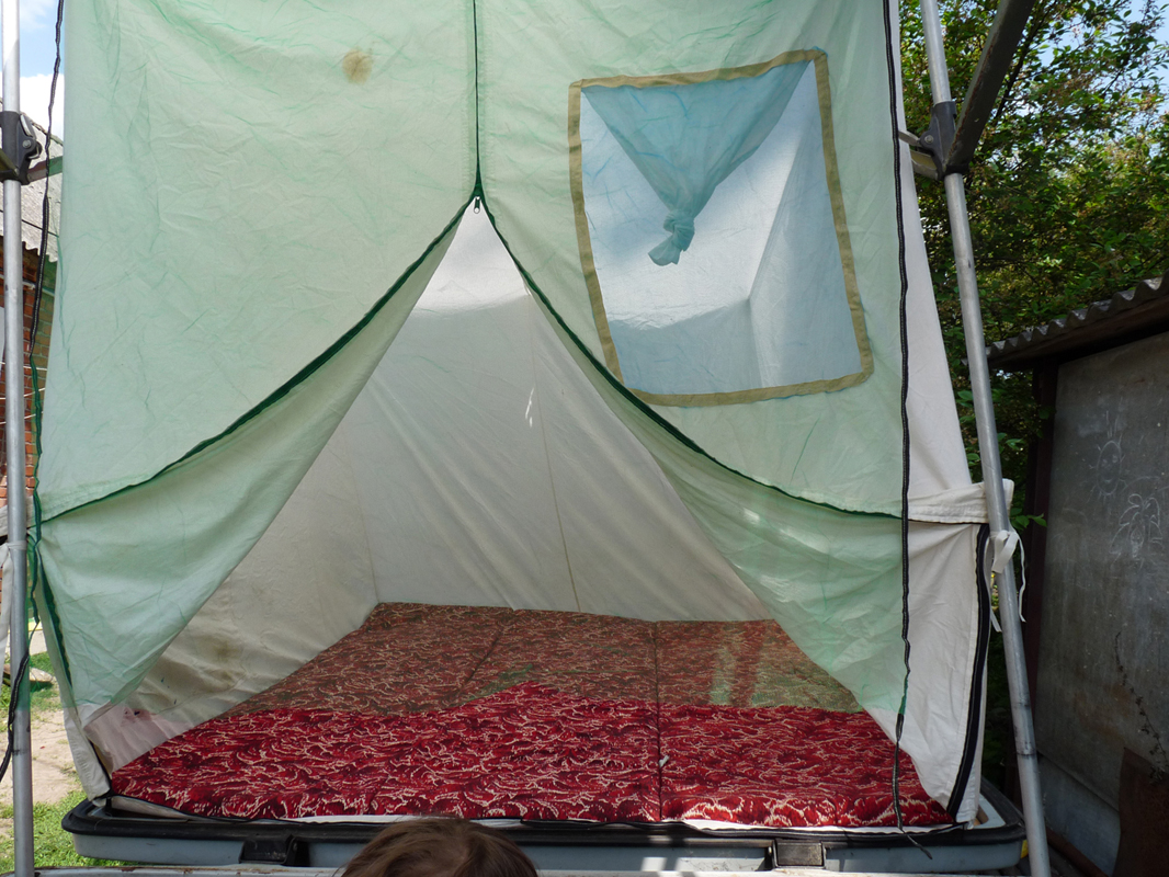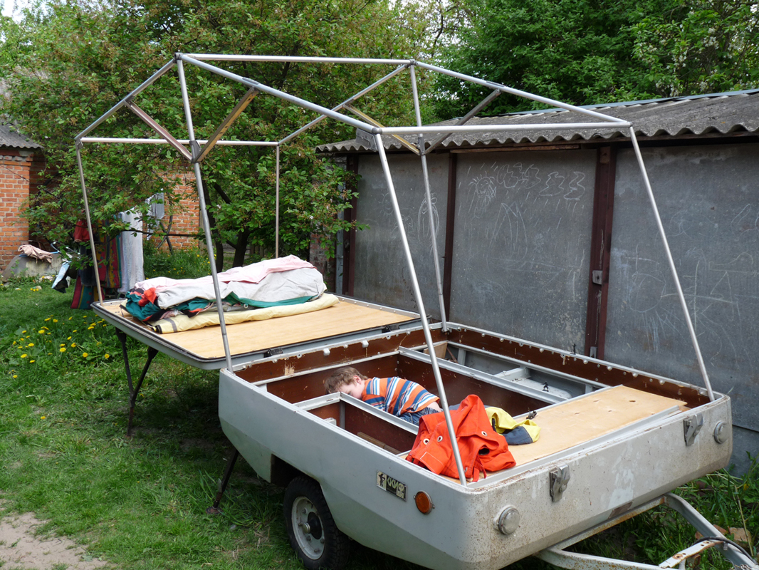 Первое что было сделано, это была пошита внутренняя палатка в спальном отделении над крышкой, с противомоскитными сетками и закрывающаяся на молнии. Вернее, декоративный полог, присутствовавший в комплекте, был дополнен полом и «дверями» на молниях. Кто бывал на Арабатке, знает зачем.