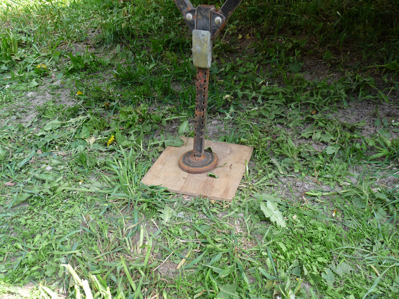 Дополнительная распорка между опорами и две регулируемые растяжки из металлического тросика. Тут-же видно самодельный буравчик-колышек, который отлично держит в песках Арабатки и маленикий уровень, по которому я выравниваю прицеп