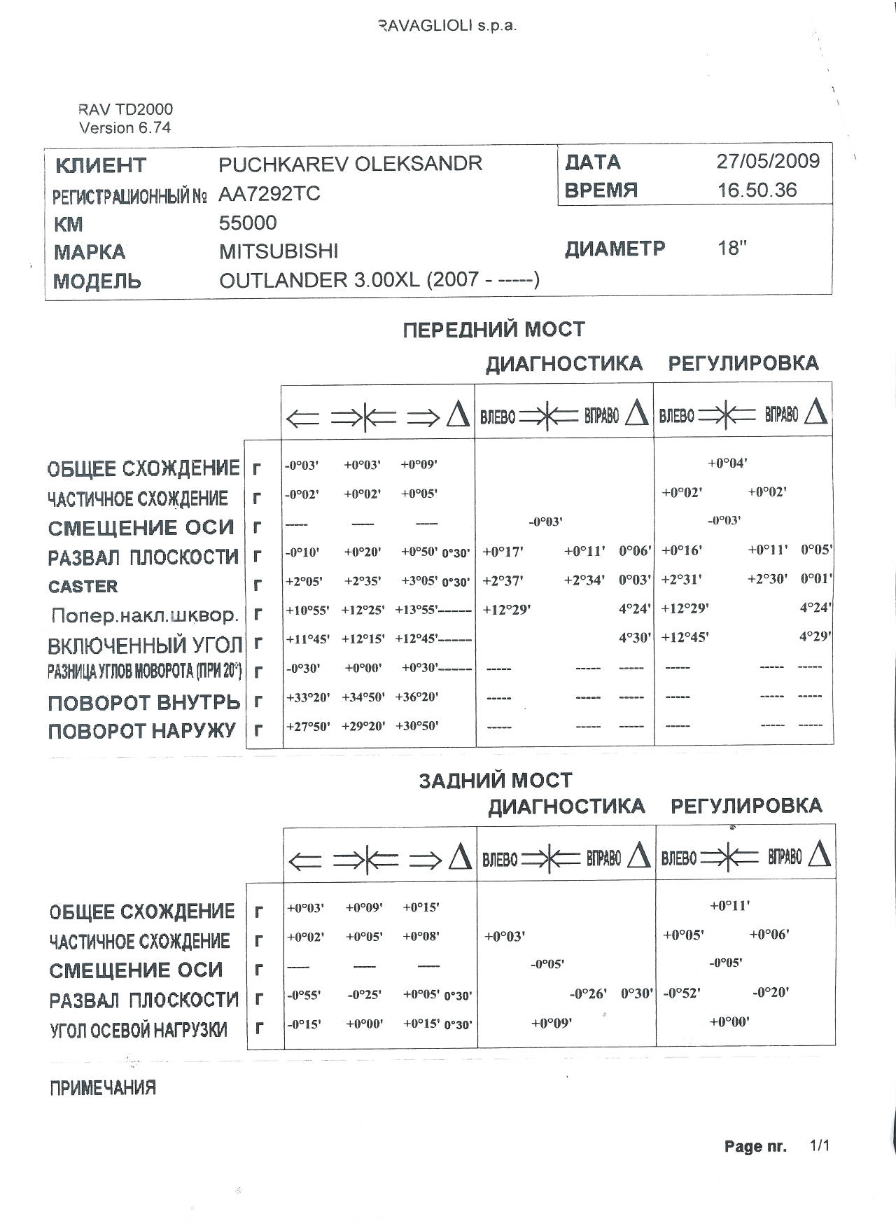 первый столбик - допустимая величина параметра "от и до" (слева, справа, разница) второй столбик - что надиагностировали (слева, справа, разница) третий столбик - после регулировки (слева, справа, разница)