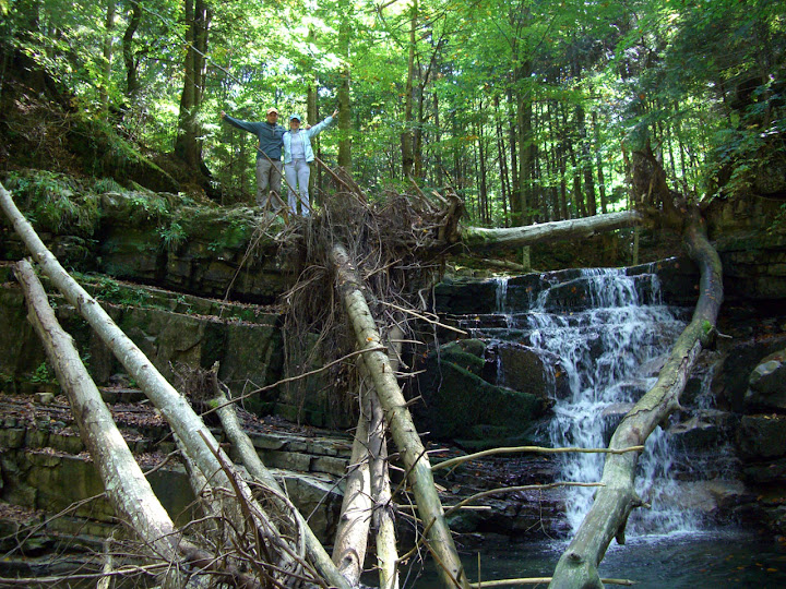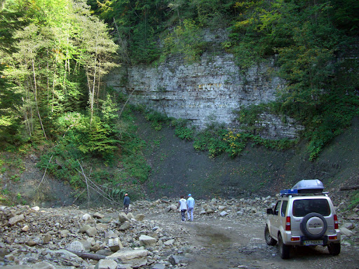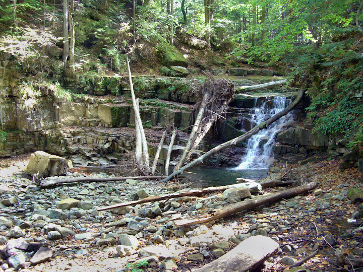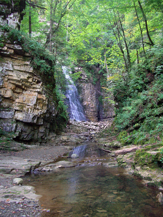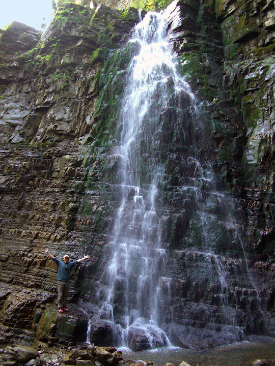Дальше дорога лежала в с. Корчин. Т.к. точные координаты водопада Гуркало известны не были, поиски начали с опроса местного населения. На вопрос, доедем ли мы по этой дороге до водопада, местный бодрый мужичок, владелец Ланоса, решил блеснуть остроумием. Он радостно поведал: "Едете по этой дороге до тех пор, пока сможете ехать. Затем возвращаетесь назад к последнему дому в селе и просите хозяев присмотреть за машиной. А сами потом идете пешком к водопаду." Я его понимаю, он ни разу в жизни не видел Suzuki Jimny. Короче, искали долго, заехали в горы раз в три дальше, чем нужно было. Хорошо хоть там начинался заповедник и дорога оказалась перекрыта. А то бы заехали к черту на кулички. Встретили компанию туристов и они, наконец, показали нам дорогу к водопаду. Он недалеко от дороги, просто с дороги не видно ни его, ни даже речки. Вот и проехали мимо три раза. Водопад Гуркало. с. Корчин, Сколевский р-н, Львовской обл. N49°5.0695' E23°28.3580'