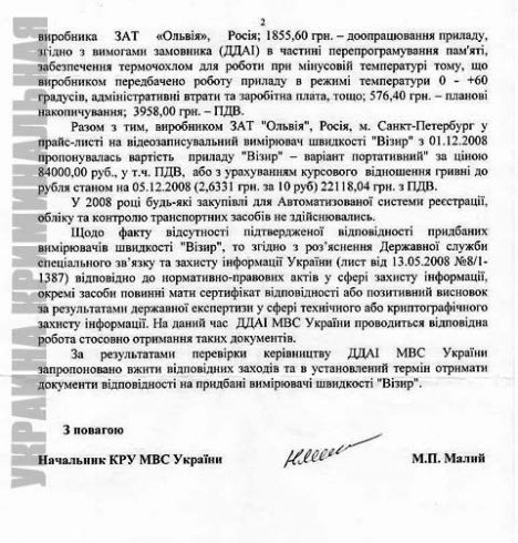 В то же время, в своем письме КРУ МВД сообщает, что ГАИ предложено сертифицировать упомянутый прибор. «Руководству Департамента ГАИ предложено принять необходимые меры и в установленный срок получить документы соответствия на приобретенные приборы «Визир», – сказано в письме.
