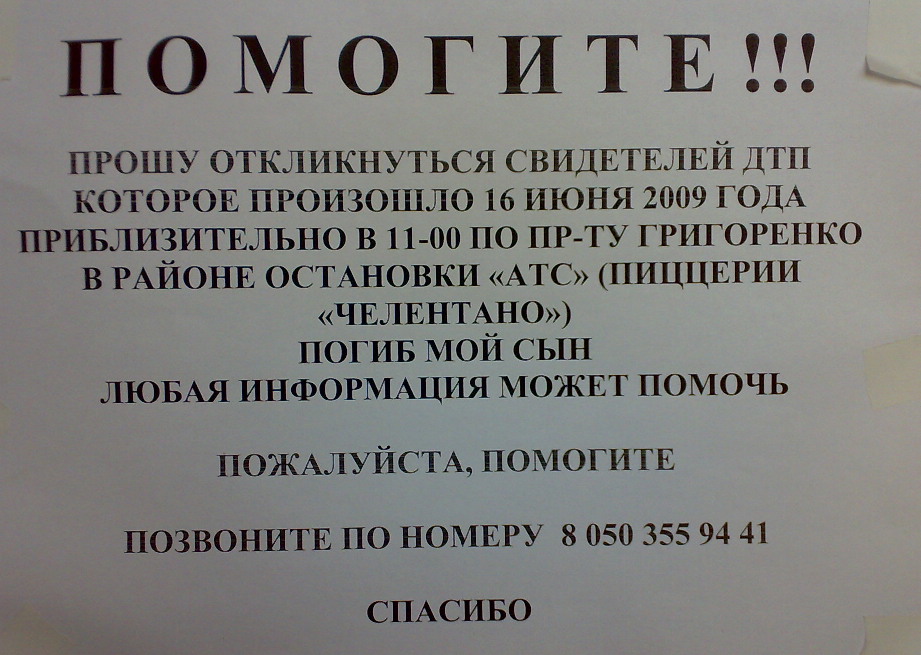 Сегодня похоронили 14-летнего мальчишку, он пролежал две недели в коме не приходя в сознание умер. 16 июня его сбила машина на ул Григоренко пересечение с ул, Ахматовой (трамвайна.остановка АТС). Водитель скрылся с места ДТП.Свидетелей родители не нашли.Если кто-то может помочь звоните по тел.8(050)355-94-41.Если возможно разместите это письмо по другим форумам. Спасибо!!