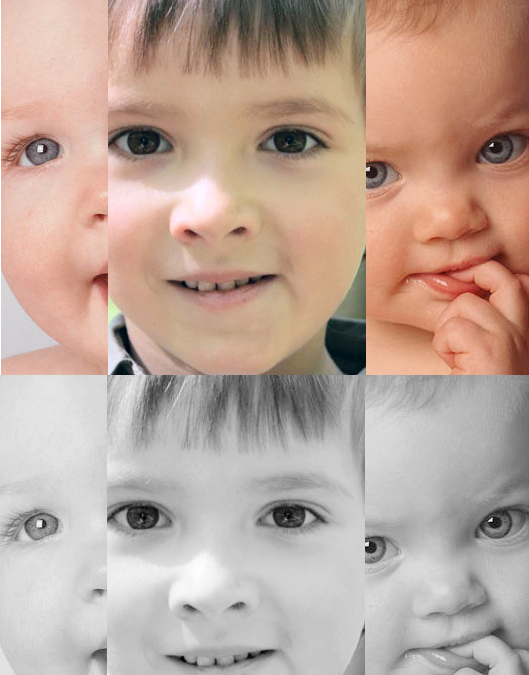 Во- первых, не стоит даже по цвету пытаться уравнивать примерно десятилетнего пацана и совсем малыша. Во-вторых - какой смысл уравнивать по контрасту то, что получено при совсем разных режимах освещения (мягкого и контрастного)?