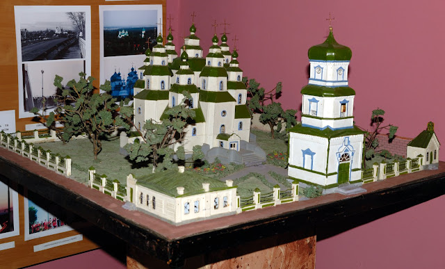 Как и музей в Петриковке, Краеведческий Музей в Новомосковске в день нашего прибывания в городе был закрыт, но для нас опять таки сделали исключения и провели небольшую экскурсию.В музеи представлен небольшой макет территории Свято - Троицкого Собора, но даже на нем одновременно увидеть все девять куполов - невозможно, такова конструкция здания, такова задумка.
