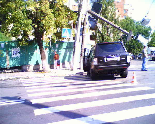Судя по столбу - удар был сильный. И "Рейндж Ровер" показал неплохую прочность... Не помню, он рамный?