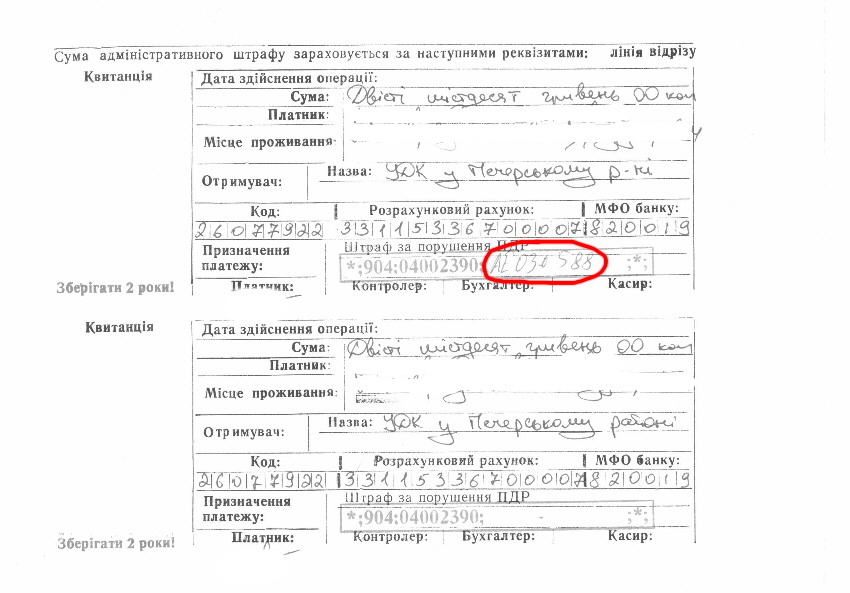 Вот и меня остановили за скорость, меряли Беркутом (или как там этот радар называется), нарушение не отрицал, выдали копию протокола и постанови. А вопрос, собственно, в следующем: на обратной стороне постанови были две квитанции, в графе "призначення платежу" которых типографским способом отпечатано "штраф за порушення ПДР", далее стоит штампик с какими-то циферками и в который гаец от руки вписал еще несколько буковок-циферов, очень смахивающие на номер паспорта . Шозанах? Все ли здесь корректно?