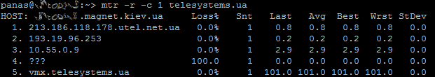 1 <1 мс <1 мс <1 мс 10.0.1.1 2 2 ms 3 ms 2 ms undefined.datagroup.com.ua [80.91.160.113] 3 1 ms 1 ms 1 ms incom.tr1-v51.ua-kiev.datagroup.ua [80.91.184.97] 4 57 ms 1 ms 2 ms r1-ae0-771.ua-kiev.datagroup.ua [80.91.178.88] 5 1 ms 1 ms 2 ms utel-10g-gw.ix.net.ua [195.35.65.227] 6 1 ms 1 ms 1 ms 10.55.0.10 7 * * ^C