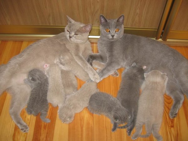 и у них вылупились котята. у Белы три мальчика, а у Мели -- шесть, две девочки и четыре мальчика. вот они все на любительском снимке