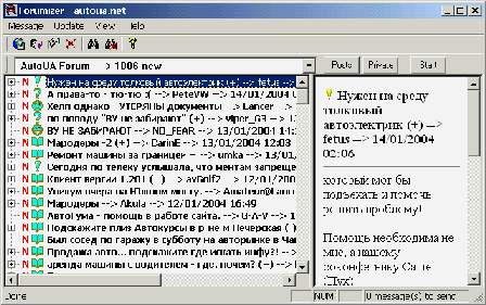 1. Запускаешь клиент. Он смотрит "список форумов" 2. галочками или другим способом отмечаешь интересные форумы, к примеру АвтоУа, Курилка, Корейский автопром. 3. Смотрит эти форумы и показывает ветки где наблюдалась активность с прошлого посещения (или за сегодня или все новые - как сейчас). 4. Выбираешь эти ветки и клиент их скачивает.